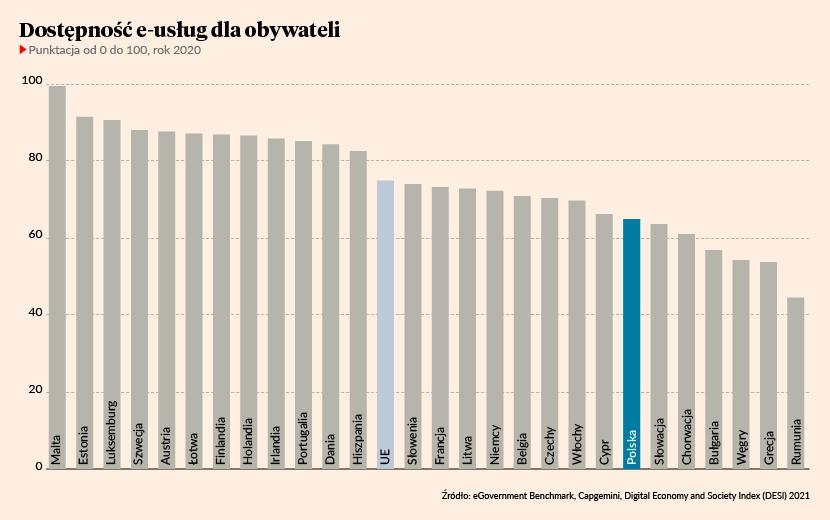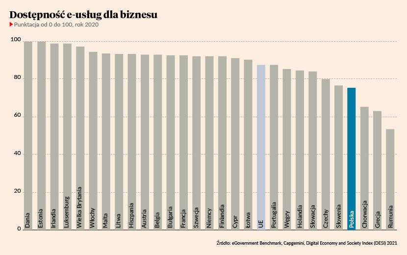 „Interesujące są wskaźniki uzyskane przez Polskę w ostatniej kategorii rankingu DESI >>Cyfrowe usługi publiczne<<. Już od kilku lat Polska niezmiennie plasuje się na odległym 20. miejscu, czyli znacznie poniżej unijnej średniej. Pozytywny aspekt to dojrzałość w zakresie dostępności otwartych danych. Pomimo rosnącej liczby użytkowników internetu na niskim poziomie pozostaje interakcja online pomiędzy organami administracji publicznej a obywatelami. W ostatnim roku Polska osiągnęła lepsze wyniki, jeśli chodzi o wstępnie wypełnione formularze, co pozwoliło zbliżyć się do średniej unijnej. W zakresie dostępności usług administracji elektronicznej dla przedsiębiorstw wynik Polski to tylko 75 punktów, podczas gdy średnia dla UE wynosi 88” — czytamy w raporcie „Rzeczpospolita cyfrowa. Cyfrowa transformacja remedium na pandemię COVID-19”, opublikowanym przez Instytut Rozwoju Europy.