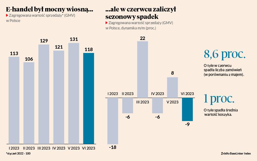 Wiosenny szczyt e-sprzedaży jest już za nami, teraz oby do świąt. Czerwcowy odczyt BaseLinker Indeksu, mierzącego kondycję polskiego e-handlu na podstawie danych o wartości sprzedaży i liczbie zamówień u ponad 3 tys. większych sprzedawców internetowych (z obrotami przekraczającymi 250 tys. zł miesięcznie), pokazuje wyhamowanie w e-zakupach. W ostatnim miesiącu e-sprzedaż spadła o 9,5 proc. w porównaniu do maja. Była jednocześnie o ponad 10 proc. wyższa niż rok wcześniej, choć tempo wzrostu jest niższe niż inflacja.