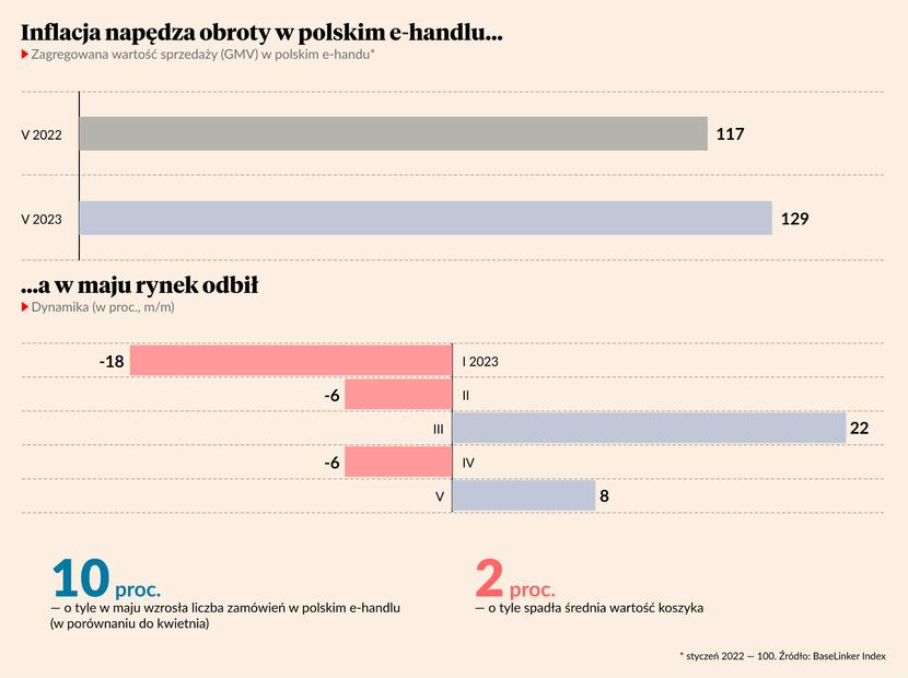 Większą zachowawczość konsumentów widać w tym, że w porównaniu z ubiegłym rokiem wartość koszyka rośnie znacznie wolniej niż liczba zamówień. W porównaniu z kwietniem średnia wartość koszyka w uwzględnianych w indeksie sklepach nawet lekko spadła — o 2 proc., ze 199 do 195 zł, podczas gdy zamówień było o 10 proc. więcej.