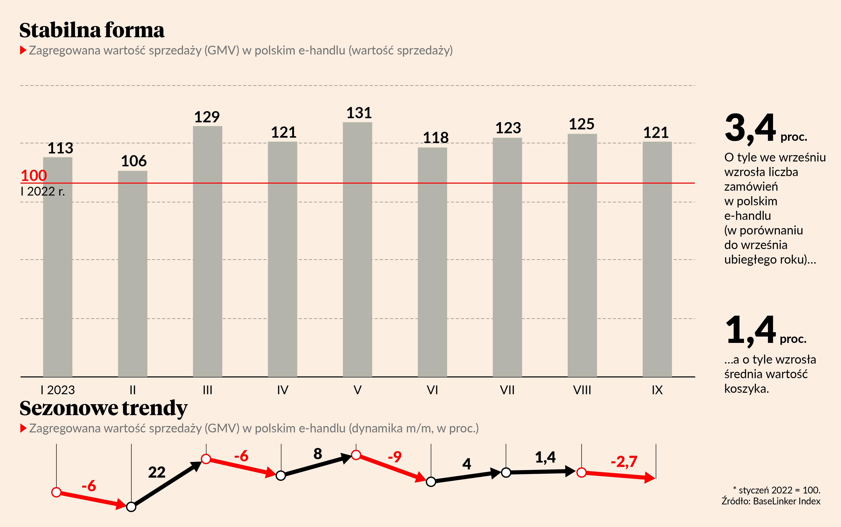 BaseLinker, dostarczający oprogramowanie dla e-sprzedawców, co miesiąc publikuje indeks kondycji polskiego e-handlu obliczany na podstawie danych sprzedażowych z 3 tys. większych polskich sklepów internetowych. We wrześniu 2023 r. wartość indeksu wyniosła 121 pkt. i była o 4 pkt. niższa niż w sierpniu, choć wyraźnie wyższa niż rok wcześniej.