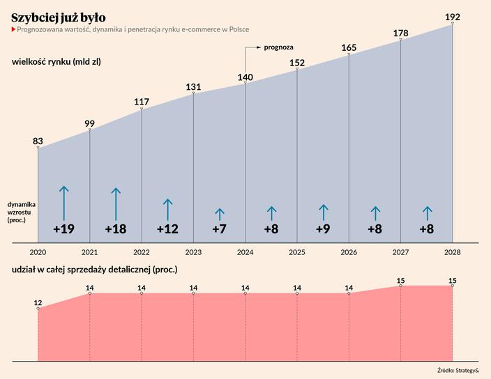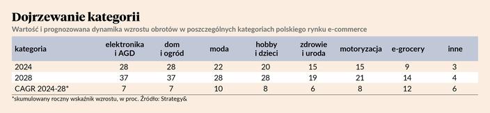 Najwięcej pieniędzy — po 28 mld zł rocznie dziś i po 37 według prognoz w 2028 r. — Polacy wydają w internecie na zakupy w dwóch kategoriach — elektronika i AGD oraz dom i ogród. Wraz z modą (22 mld zł w tym roku) odpowiadają one za 60 proc. w e-handlu. Eksperci Strategy& prognozują, że zakupy modowe nadal będą rosnąć w dwucyfrowym tempie, ale w większych kategoriach wzrost będzie wolniejszy ze względu na dojrzałość i nasycenie rynku. Wskazują, że w krótkiej perspektywie — w najbliższym roku — spowolnienie będzie najbardziej widoczne w kategorii dom i ogród.