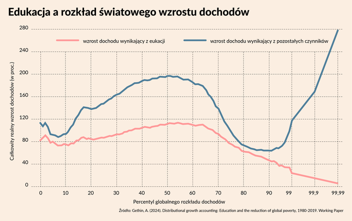 „Przy konserwatywnych założeniach edukacja odpowiada za 50 proc. globalnego wzrostu gospodarczego, 70 proc. wzrostu dochodów wśród najbiedniejszych 20 proc. ludzi i 40 proc. redukcji skrajnego ubóstwa od 1980 r.". Takiego naukowego odkrycia dokonał badacz Amory Gethin, który swoje wyniki przedstawił w przełomowym artykule „Distributional Growth Accounting: Education and the Reduction of Global Poverty". Ponadto stopa zwrotu (pokazująca o ile procent wzrastają roczne zarobki za każdy dodatkowy rok nauki) przedstawiona jako mediana ze 150 analizowanych państw wynosi 5 proc. rocznie za rok edukacji podstawowej, 9 proc. za średnią i 13 proc. za wyższą.