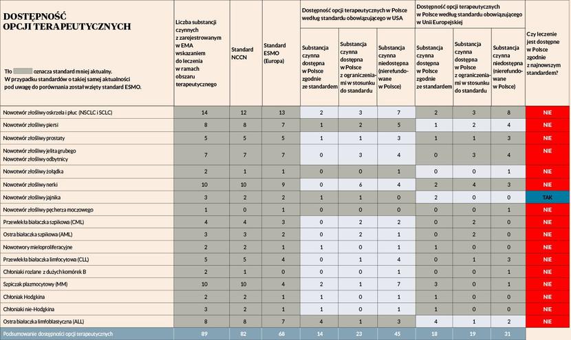 Jednym z kluczowych wątków raportu był dostęp do innowacyjnych leków onkologicznych. Analiza schematów leczenia 20 nowotworów wyraźnie wskazała, że tylko w przypadku złośliwego raka jajnika polskie pacjentki otrzymują leczenie zgodne z najnowszymi standardami. Spośród 94 molekuł zarejestrowanych w latach 2004-16, aż 50 nie ma refundacji we wskazaniach onkologicznych, 32 są dostępne w ramach programów lekowych, a kolejne 12 w katalogu chemioterapii. Tylko jeden preparat trafił na apteczne półki. W ocenie ekspertów, blisko połowa opcji terapeutycznych ujętych w standardach światowych nie jest w Polsce dostępna. Pozostałe molekuły są dostępne w stopniu znacznie ograniczonym, czyli w II lub III linii leczenia bądź dla wąskiej grupy chorych spełniających kryteria kwalifikacji do programów lekowych.