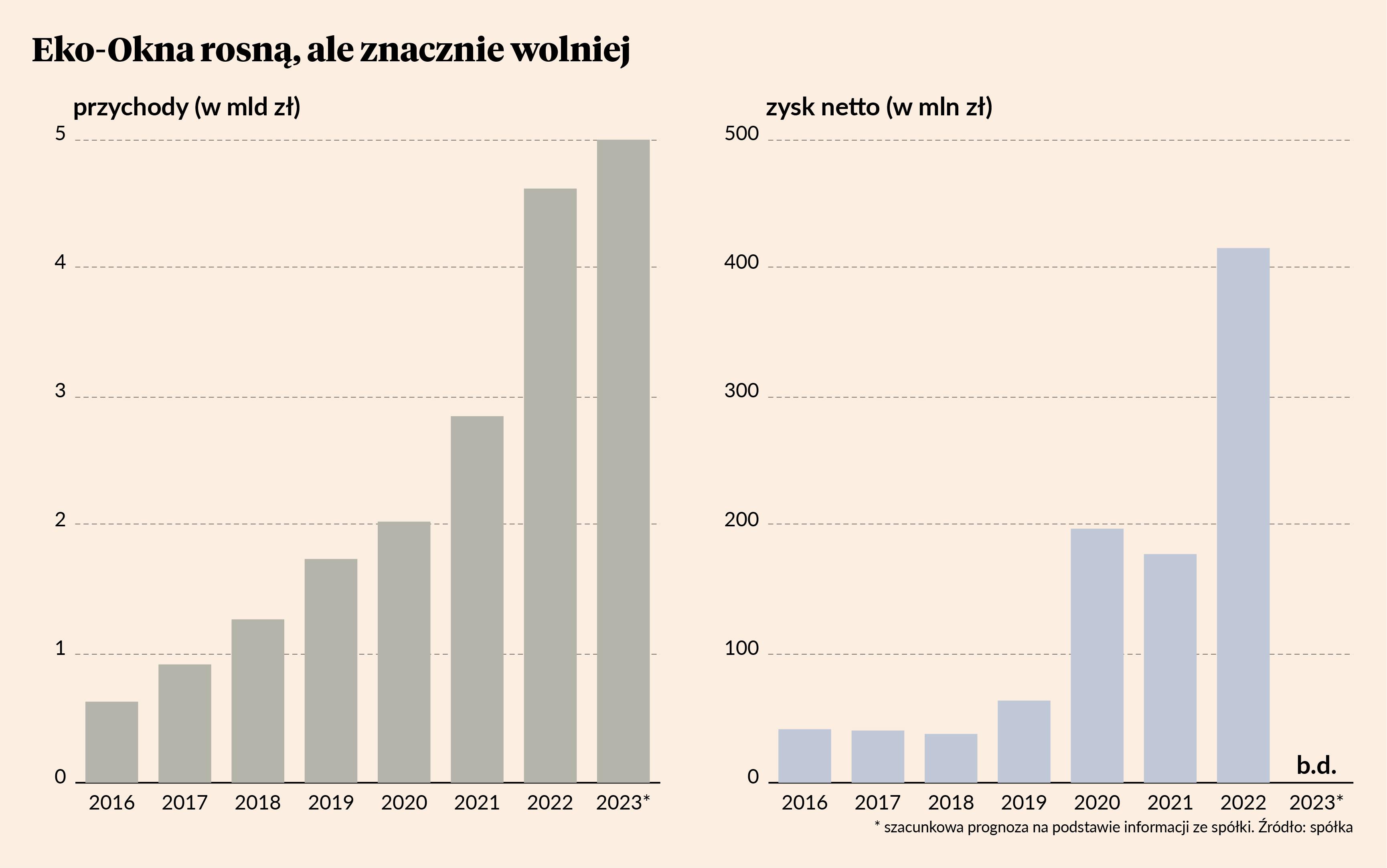 Przypomnijmy, że w 2022 r. Eko-Okna wypracowały ponad 415 mln zł czystego zysku. Więc nawet gdyby w tym roku wynik był o kilkanaście albo kilkadziesiąt procent niższy, i tak oznaczałoby to znaczną sumę.