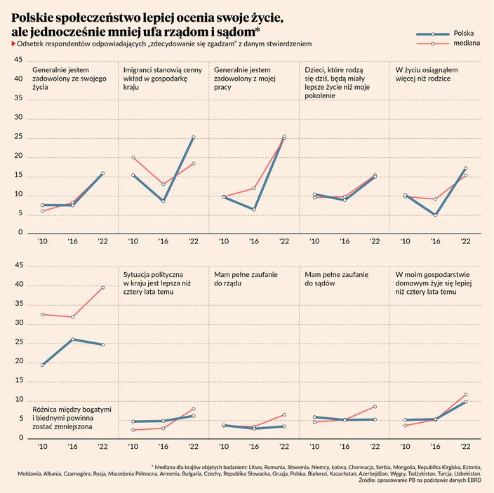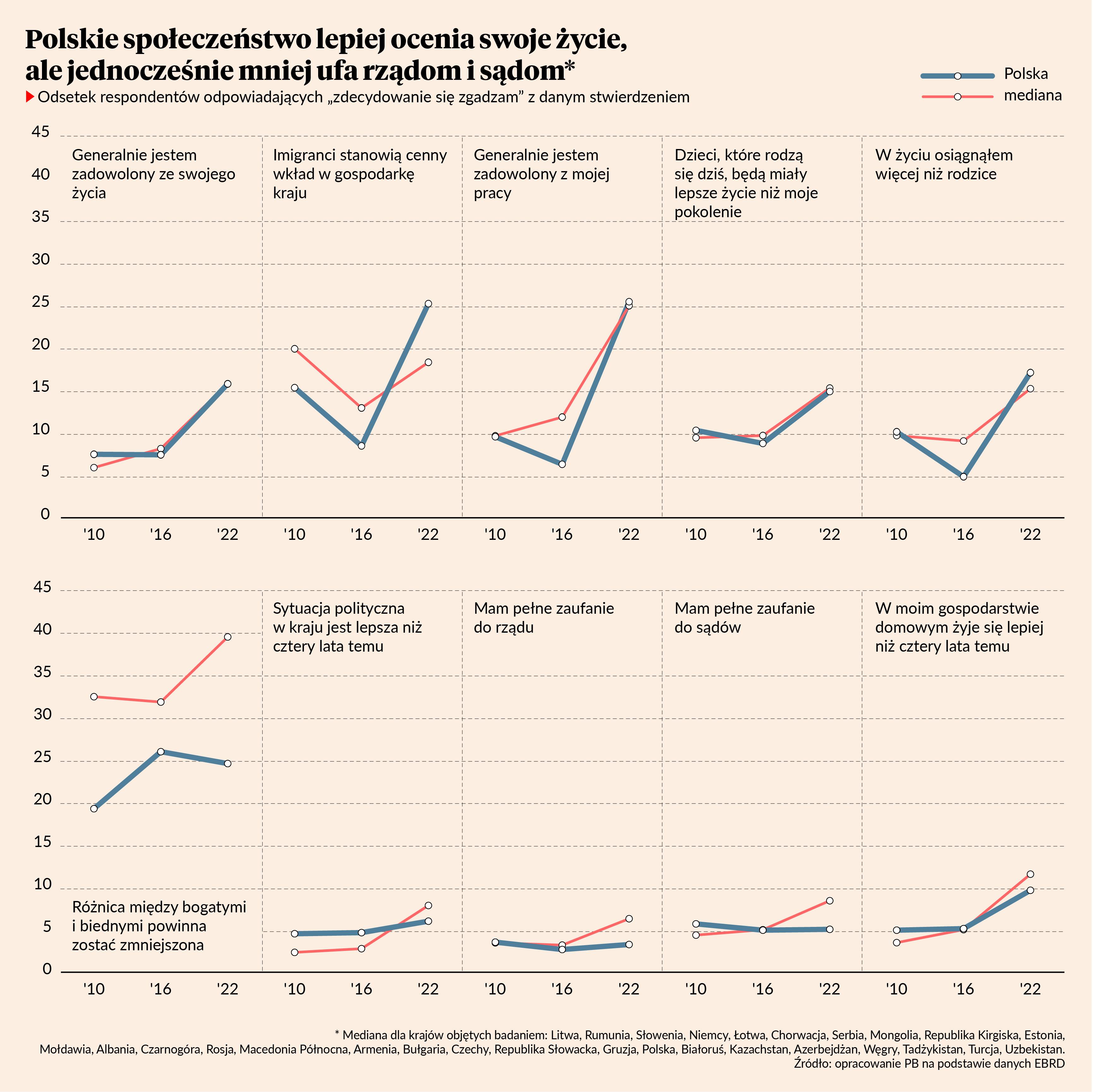 Polskie społeczeństwo podlega diametralnym zmianom, lecz raczej nie odbiegają one od trendów występujących w innych krajach na podobnym poziomie rozwoju. Szybko rośnie nasza satysfakcja życiowa, chociaż dopiero od 2016 r. Odsetek respondentów odpowiadających „zdecydowanie się zgadzam” na stwierdzenie „generalnie jestem zadowolony ze swojego życia” w Polsce w latach 2010-2016 zmniejszył się z 7,5 proc. do 7,4 proc., lecz w latach 2016-2022 zwiększył się z 7,4 proc. do 15,8 proc. Nic dziwnego. Pierwszy okres to rosnąca stopa bezrobocia i relatywnie niska stopa wzrostu gospodarczego związana z dekoniunkturą w strefie euro, natomiast drugi okres to boom gospodarczy, wynikający m.in. z poprawy koniunktury na głównych rynkach eksportowych, nie licząc okresu pandemii.
