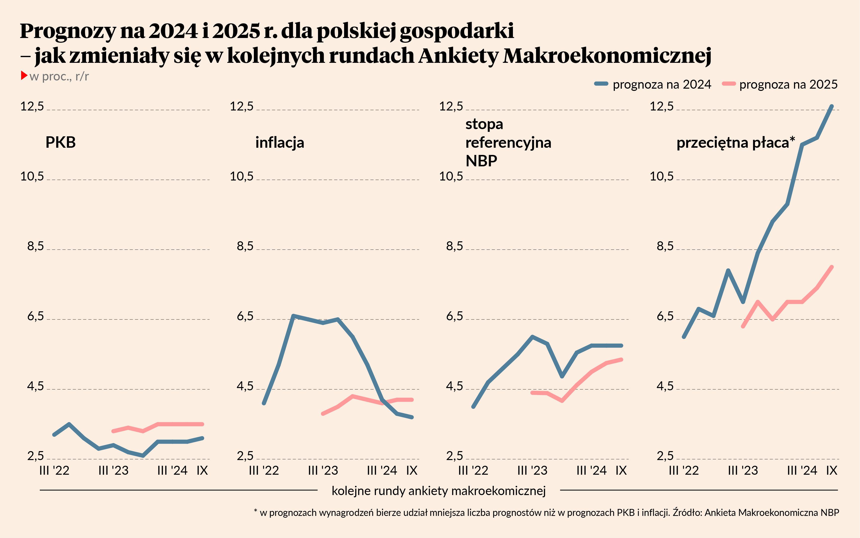 Dlaczego ekonomiści nie wierzą w istotne luzowanie polityki pieniężnej w Polsce? Odpowiedzią jest dynamika płac. Jest ona zaskakująco wysoka. Obecnie mediana prognoz dynamiki płac na 2025 r. wynosi 8 proc., podczas gdy w czerwcu wynosiła 7,4 proc. Jeszcze bardziej podnoszone są prognozy na ten rok, bo bieżące dane systematycznie zaskakują in plus. Obecnie mediana przewidywań na 2024 r. to aż 12,6 proc. Te zmiany dobrze widać na wykresie.