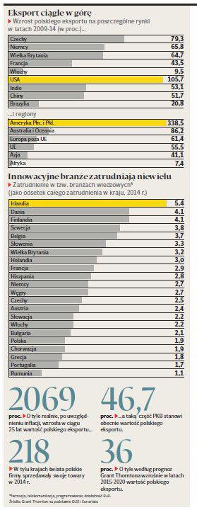 — To spory skok naprzód, choć trzeba pamiętać, że w wyrobach przetworzonych nadal dominują komponenty i półprodukty, natomiast produkty finalne stanowią tylko ok. 45 proc. naszego eksportu — zwraca uwagę Tomasz Wróblewski, partner zarządzający Grant Thornton w Polsce. Ponadto polskie firmy coraz odważniej wchodzą na nowe, nieodkryte dotychczas rynki. Zgodnie ze statystykami GUS, nasze towary w 2014 r. były sprzedawane w 218 krajach świata, w tym tak egzotycznych jak Gwinea Równikowa, Wyspy Kokosowe czy Kiribati. W okresie 2009-14 dynamicznie rósł eksport do krajów Ameryki Północnej i Południowej (o 338,5 proc.), Australii i Oceanii (86,2 proc.), Europy poza Unią Europejską (o 61,4 proc.) oraz Azji (41 proc.). Szczególnie wysokie zwyżki odnotowaliśmy w takich krajach, jak USA, Indie, Chiny czy Brazylia.
