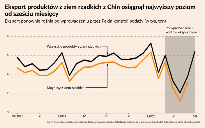 Eksport gwałtownie załamał się w kwietniu i maju, gdy Pekin wprowadził szerokie ograniczenia w dostawach magnesów, odpowiadając na groźby nowych ceł ze strony Waszyngtonu. Po zawarciu tymczasowego rozejmu handlowego Chiny zobowiązały się jednak do zwiększenia eksportu.