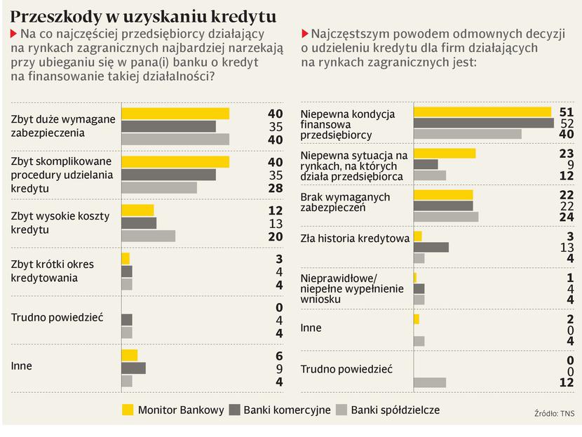 Tymczasem banki twierdzą, że chętnie udzielą eksporterom finansowania, ale ci też muszą banki zrozumieć i odpowiednio się przygotować do współpracy. W dalszej kolejności przedsiębiorcy wymieniają zbyt skomplikowane procedury udzielania kredytu i zbyt wysokie koszty. Natomiast najczęstszym powodem odmownych decyzji o udzielenie kredytu jest niepewna kondycja finansowa przedsiębiorcy, niepewna sytuacja na rynkach, a dopiero w dalszej kolejności brak odpowiednich zabezpieczeń. Mimo tych przeszkód to banki stanowią główne źródło finansowania zewnętrznego działalności zagranicznej eksporterów. W ciągu ostatniego roku polskie firmy prowadzące działalność za granicą wzięły więcej kredytów i pożyczek niż przed rokiem. W kolejnym roku liczba takich kredytów jeszcze wzrośnie.