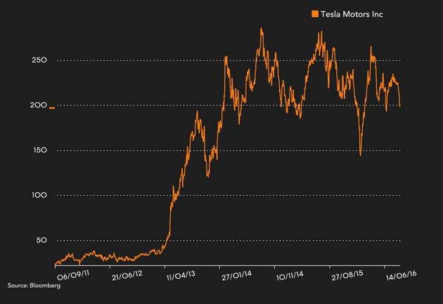 Notowania Tesli na giełdzie w Nowym Jorku w ostatnich 5 latach. Źródło: Bloomberg.