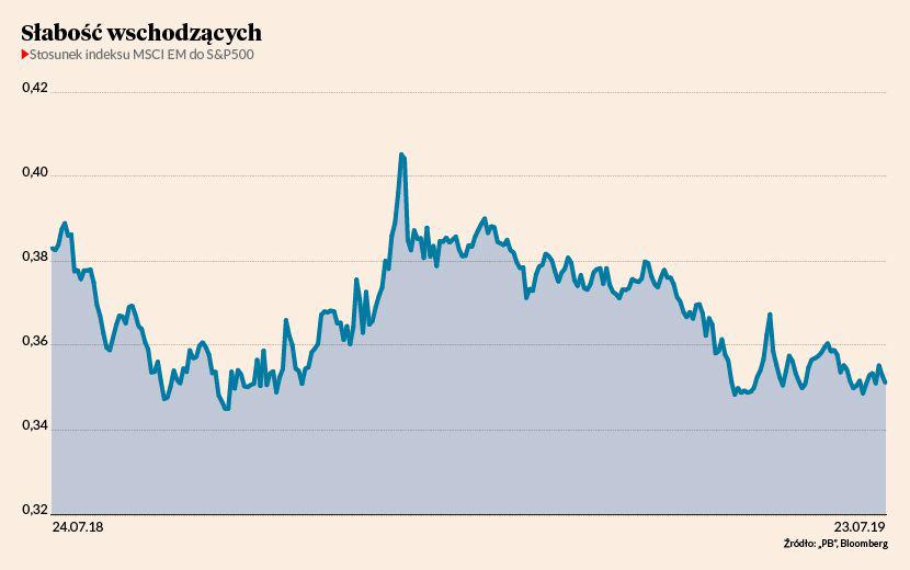 Koniec cyklu podwyżek stóp procentowych w Stanach Zjednoczonych miał poszerzyć strumień kapitału płynący na emerging markets i uczynić je bardziej zyskownym miejscem do inwestowania niż rynki rozwinięte. Nic z tego. Mimo że indeks MSCI Emerging Markets urósł od końca maja o 6 proc., a od początku roku o prawie 11 proc., to amerykański S&P500zyskał więcej: odpowiednio 9 i 20 proc. Relatywna siła obu wskaźników pozostaje w pobliżu poziomu najniższego od października ubiegłego roku, a perspektywy krótkoterminowe nie są optymistyczne dla aktywów rynków rozwijających się. Inwestorzy przez ostatnich 13 tygodni wycofali bowiem z akcji emerging markets 18 mld USD. W ostatnim tygodniu ulokowali natomiast 7,4 mld USD w akcjach amerykańskich, najwięcej od miesiąca — wynika z danych Jefferies Financial Group. W pierwszym półroczu rodzime fundusze akcji amerykańskich zarobiły średnio 15 proc., a najlepszy wynik osiągnął AXA Akcji Amerykańskich (20,8 proc.). Średni wynik funduszy akcji globalnych rynków wschodzących wyniósł natomiast 9,6 proc. Najlepszym osiągnięciem może się pochwalić MetLife Akcji Rynków Wschodzących (13,1 proc.).