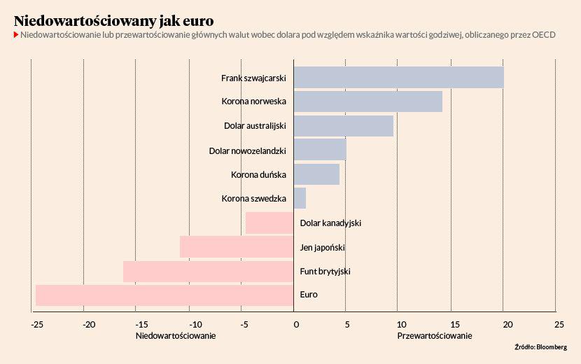 Niedowartościowanie euro względem dolara sięga od 9 do 25 proc., wskazują cztery miary stosowane przez organizację. Jeśli pod uwagę brać wskaźnik oparty na porównaniu siły nabywczej pieniądza, euro jest najbardziej niedowartościowane spośród monitorowanych przez Bloomberga 10 głównych walut z rynków dojrzałych oraz dolara. Niedowartościowanie to wynosi blisko 25 proc. Wyraźnie mniej niż euro niedowartościowane są brytyjski funt oraz jen japoński, a najbardziej przewartościowane są frank szwajcarski oraz korona norweska, wynika z odczytów obliczanego przez OECD wskaźnika.