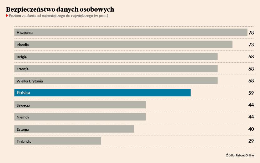 Na pierwszym miejscu niechlubnego podium jest Hiszpania — aż 78 proc. obywateli nie ma zaufania do władz w tej kwestii. Na drugim znalazła się Irlandia — 73 proc. obywateli twierdzi, że ich dane osobowe nie są bezpieczne. Na trzecim są Belgia, Francja i Wielka Brytania z 68-procentowym odsetkiem.