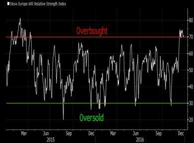 Wskaźnik siły relatywnej dla Stoxx Europe 600. Kolorem czerwonym zaznaczono poziom wykupienia, kolorem zielonym – poziom wyprzedania. Źródło: Bloomberg.