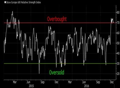 Jednak z drugiej strony rynek jest już wykupiony. Wskaźnik siły relatywnej dla Stoxx Europe 600 przekraczał uważany za granicę wykupienia pułap 70 punktów od 13 sesji, co nie zdarzyło się od marca 2015 r.