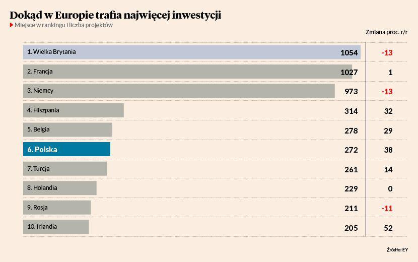 Wynik jest tym lepszy, że w całej Europie inwestycji ubyło po raz pierwszy od sześciu lat. W ubiegłym roku zrealizowano 6356 projektów, o 4 proc. mniej niż w 2017 r. Największy, aż o 51-proc. spadek, zanotowały Czechy, które zanurkowały w europejskim rankingu z 12. na 20. miejsce. Także Wielka Brytania i Niemcy, największe gospodarki kontynentu, zanotowały o 13 proc. projektów BIZ mniej (pierwsza przez brexit, druga przez wolniejszy wzrost gospodarczy i gorsze wyniki przemysłu motoryzacyjnego), natomiast Francji udało się zwiększyć ich poziom tylko o 1 proc. (po dwóch latach wzrostu w okolicach 30 proc.).