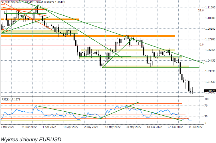 A co na innych parach? Mimo ogromnej presji parytet na EURUSD nie został wyraźnie złamany - minimum to 0,99979 i później rynek zawrócił w górę. Wiele będzie zależeć teraz od wystąpień członków FED - na ile będą oni skłonni podnieść stopy procentowe o 100 punktów w lipcu, ale i też “przecieków z ECB. Teoretycznie rynek spodziewa się ruchu o 25 punktów w lipcu i dalej 50 punktów w sierpniu. Mogłoby się wydawać, że przy strachu przed recesją, ECB nie zaskoczy, ale... być może strategia ”ruchu wyprzedzającego“ także i tutaj byłaby bardziej zasadna? Na jesieni ryzyka dla wzrostu gospodarczego będą przecież większe, niż teraz. Być może taki scenariusz byłby też wytłumaczeniem dla ewentualnego odbicia EURUSD w stronę 1,0350. Posiedzenie EBC jest zaplanowane na 21 lipca.