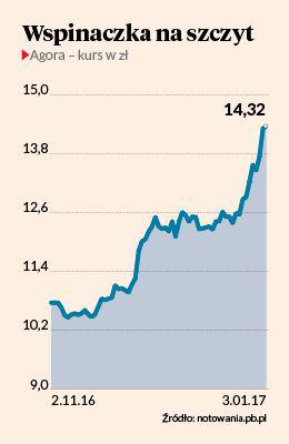 — Dobrze radzi sobie segment kinowy, a w segmencie prasy widać intensywną pracę nad obroną rentowności: zamknięto „Metrocafe.pl” i przeprowadzono zwolnienia. To wszystko uzasadnia wzrost notowań, choć wydaje się, że potencjał do dalszego wzrostu jest już ograniczony — ocenia Dominik Niszcz. Analitycy są w większości pozytywnie nastawieni do Agory: spośród 7 dostępnych obecnie rekomendacji 4 to „kupuj”, a 7 — „trzymaj”, nikt nie zaleca sprzedaży akcji. Największym akcjonariuszem spółki jest Agora-Holding, należąca do twórców „GW”. Ma ona tylko 11,33 proc. kapitału, ale dzięki uprzywilejowaniu akcji i zapisom statutowym faktycznie kontroluje Agorę. Prawie 16 proc. akcji ma OFE PZU, a 11,22 proc. — Media Development Investment Fund, współtworzony przez George’a Sorosa. Powyżej progu 5 proc. są jeszcze dwa fundusze emerytalne — Nationale-Nederlanden i Aegon.