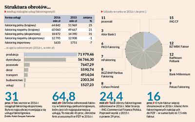 Piotr Gąsiorowski, prezes eFaktora, również ma nadzieję na lepsze wyniki w 2017 r. — Rynek napędzają większe obciążenia sektora bankowego i zaostrzenie polityki kredytowej wobec przedsiębiorców, co widać np. w ankiecie przeprowadzonej przez NBP. Drugi powód to poszerzanie oferty faktoringowej. Jest coraz więcej możliwościskorzystania z tych usług przez małe, a nawet mikrofirmy. Faktoring w Polsce nie osiągnął jeszcze wielkóści z Europy Zachodniej, więc nic nie powinno zagrozić rozwojowi w tym roku — uważa Piotr Gąsiorowski. Jerzy Dąbrowski, wiceprzewodniczący Komitetu Wykonawczego w Polskim Związku Faktorów, dodaje, że faktorzy tak jak każda branża najbardziej obawiają się zmian regulacji prawnych. W 2016 r. z faktoringu skorzystało w Polsce 7853 klientów (ponad 800 więcej niż w 2015 r.), którzy przedstawili do wykupu 7,5 mln faktur, czyli o 11,5 proc. więcej niż w 2015 r.
