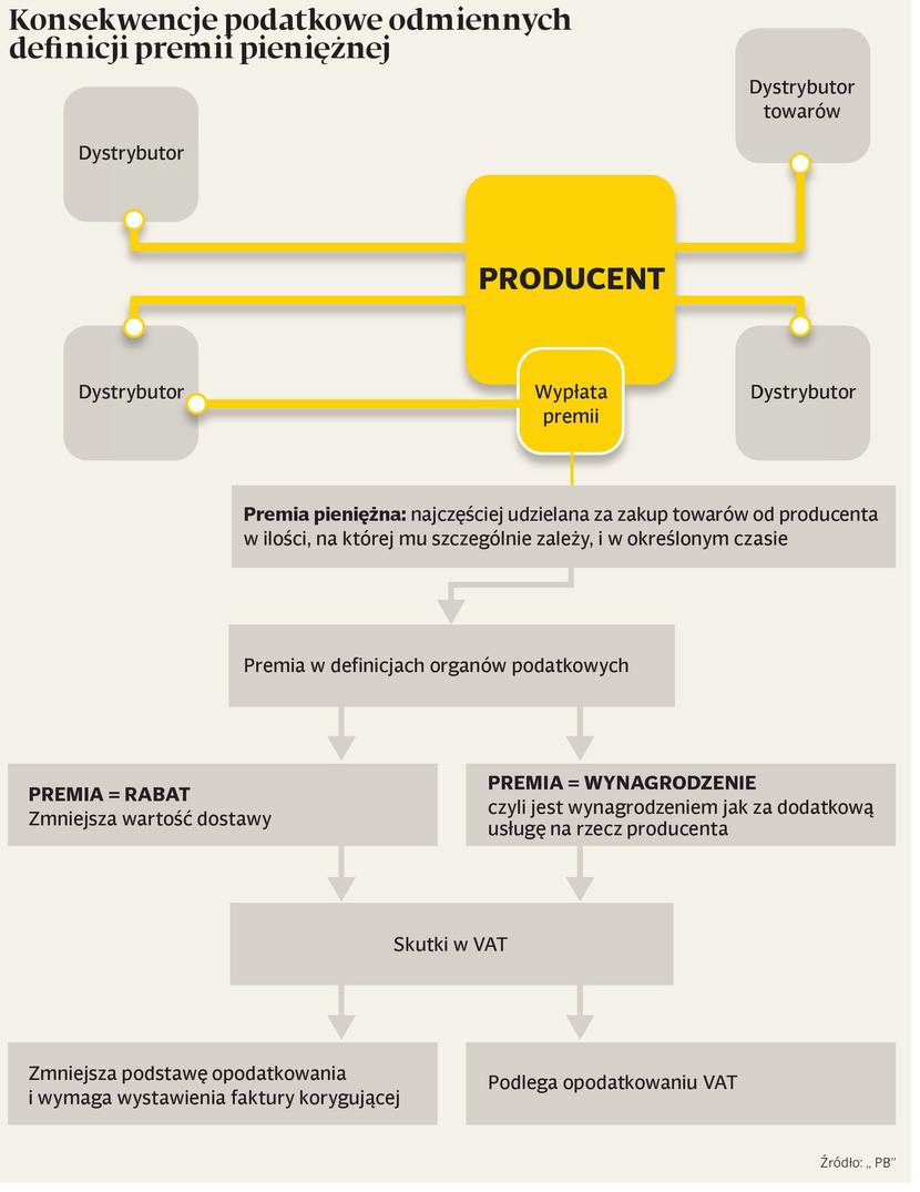Również sądy administracyjne obecnie twierdzą, że premie te nie są wynagrodzeniem. Różnią się natomiast w poglądach na temat zasad ich dokumentowania. W ocenie jednych powinna być ona ujmowana w powiązaniu z dostawą towarów, jako rabat, czyli zmniejszenie obrotu, którego dotyczy. Tak samo uważają organy podatkowe. Jak podkreśla np. Izba Skarbowa w Lublinie, taka premia prowadzi do obniżenia wartości dostawy. W związku z tym skoro zgodnie z ustawą o VAT udzielony rabat pomniejsza podstawę opodatkowania, to sprzedawca udzielający premii powinien wystawić fakturę korygującą i tym samym pomniejszyć podstawę opodatkowania VAT, a nabywca dokonać korekty podatku naliczonego. Inne sądy wyrokują z kolei, że przyznanie premii nie ma wpływu na wcześniejsze dostawy. I powinna być dokumentowana wystawianą przez odbiorcę premii notą księgową.