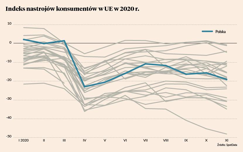 Nastroje w biznesie nie są tak złe, jak wskazywałaby skala restrykcji gospodarczych. Wprawdzie konsumenci raportują wysoki stopień pesymizmu, ale wśród firm nie widać bardzo głębokiego pogorszenia w stosunku do lata. Jest to kolejny dowód na stawianą przeze mnie tezę, że oczekiwanie poprawy koniunktury w 2021 roku stabilizuje sytuację w gospodarce.