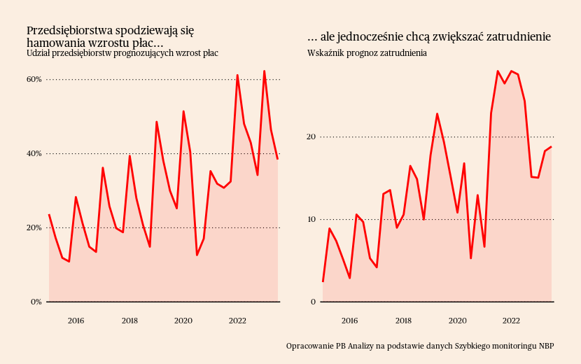 Same płace nie spowodują, że inflacja utrzyma się na poziomie 15 czy 10 proc. r/r. Bardziej prawdopodobnym scenariuszem jest dalsza dezinflacja, która jeszcze przytłumi nominalną dynamikę wzrostu płac. Zmniejsza się udział firm podwyższających płace, co można traktować jako zapowiedź wyhamowania wzrostu wynagrodzeń, aczkolwiek rynek pracy nadal jest rozgrzany.