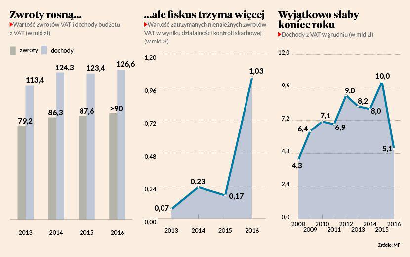 Szybsza i skuteczniejsza praca kontrolerów pozwala też szybciej oddzielać oszustów od uczciwych przedsiębiorców. W 2015 r. średni czas postępowania w zakresie zwrotu podatku VAT, od momentu złożenia deklaracji do zakończenia postępowania, wynosił 66,9 dnia, a w 2016 r. już tylko 37,4 dnia, choć przyspieszenie nastąpiło dopiero w drugiej połowie roku. Eksperci nie mają jednak wątpliwości, że resort finansów nie przyspieszyłby przelewów VAT, gdyby nie miał w tym interesu. — To tylko hipoteza, ale być może MF chciało zaksięgować zwroty VAT jeszcze w 2016 r. — widząc, że deficyt jest dość niski — żeby dać sobie nieco więcej luzu w budżecie 2017, który prawdopodobnie będzie trudniejszy od poprzedniego — mówi Arkadiusz Łagowski, doradca podatkowy w firmie Grant Thornton. Księgowe sztuczki to domena nie tylko obecnej ekipy. Przyspieszone zwroty lub blokada, zwłaszcza pod koniec roku, były wielokrotnie wykorzystywane przez fiskusa. — To skuteczna metoda, żeby poprawić statystykę budżetu państwa, i to w znaczącej skali — twierdzi były urzędnik ze Świętokrzyskiej.