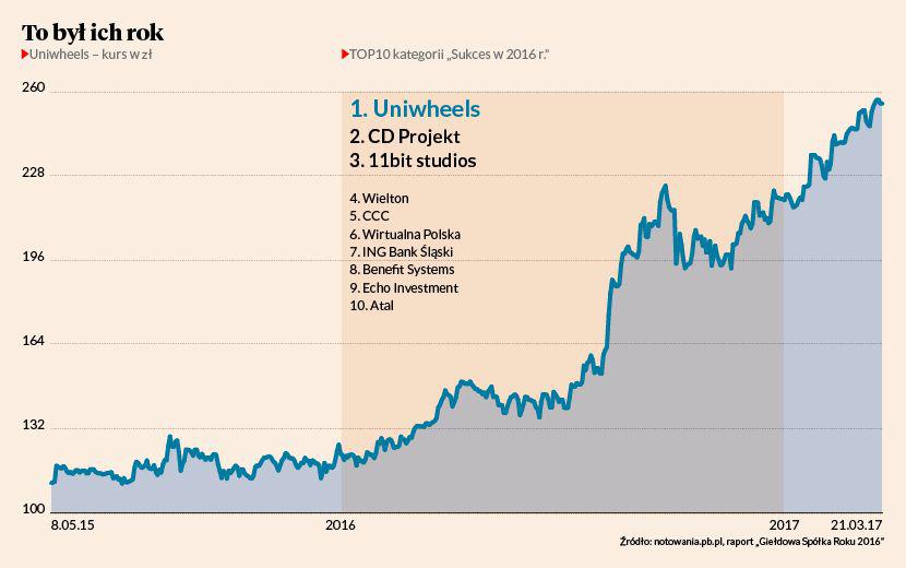 Firma Uniwheels, która jest jednym z największych w Europie producentów aluminiowych felg, miniony rok z pewnością zaliczy do udanych. Notowane na GPW akcje grupy podrożały w ciągu 12 miesięcy o trzy czwarte. Po trzech kwartałach jej czysty zysk był wyższy niż ten, który spółka wypracowała w całym 2015 r. Rezultaty finansowe za cały rok, jak przekonuje zarząd, będą również bardzo dobre. Spółka spodziewa się wzrostu zysku z podstawowej działalności o 13-18 proc. I to wszystko mimo sporych wysiłków inwestycyjnych, na jakie zdecydowała się w minionym roku. W rezultacie w rankingu Giełdowa Spółka Roku 2016 w kategorii „Sukces w 2016 r.” firma Uniwheels zdeklasowała rywali.