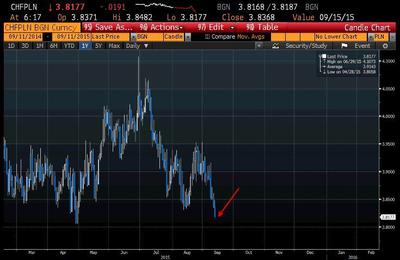 W piątek kurs EUR/CHF znajdował się ponad barierą 1,1 po raz pierwszy od stycznia, kiedy bank centralny Szwajcarii zaprzestał bronienia poziomu 1,2. Notowania CHF/PLN spadły do 3,81 zł i było to najmniej od kwietnia.