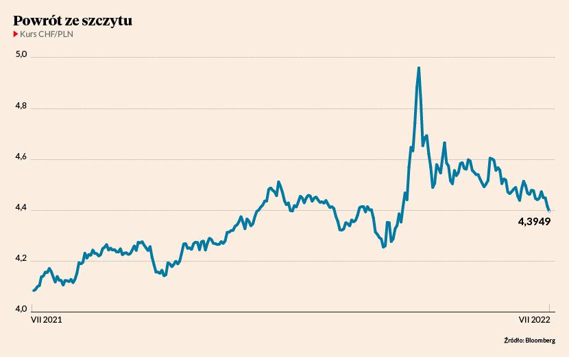 We wtorek, 7 czerwca. kurs franka szwajcarskiego do złotego po raz pierwszy od wybuchu wojny na Ukrainie znalazł się poniżej 4,40 zł. Wciąż są to bardzo wysokie poziomy w ujęciu historycznym (przed listopadem 2021 r. kurs CHF/PLN nigdy nie przekraczał 4,40 zł), lecz już wyraźnie niższe niż w szczycie marcowej paniki, gdy frank w porywach kosztował prawie 5 zł.