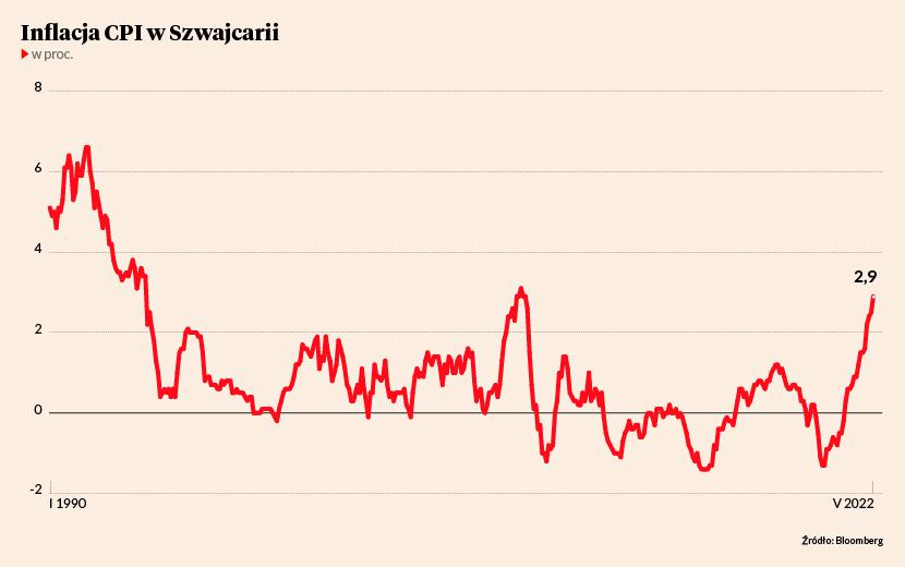 O ile osłabienie franka szwajcarskiego niespecjalnie kogokolwiek martwi, to coraz większym problemem staje się inflacja. Ta ostatnia przez wiele poprzednich lat w Szwajcarii praktycznie nie występowała. Od początku XXI wieku średnia inflacja CPI w tym alpejskim kraju wyniosła 0,4 proc. rocznie (tak, rocznie, a nie miesięcznie). Przez poprzednie dwa lata Helweci doświadczali na ogół łagodnej deflacji cenowej, a w poprzedniej dekadzie roczna dynamika inflacji CPI przez zdecydowaną większość czasu zawierała się w przedziale od -1 do 1 proc. r/r.