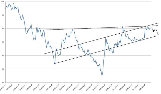 Tak ustalony wskaźnik powinien osłabić się w horyzoncie sięgającym połowy przyszłego roku o kilkanaście proc. Po ukształtowaniu formacji szczytowej, ograniczanej od góry linią poprowadzoną po maksimach z ostatnich 16 lat, powinien zawrócić na południe w ramach kanału opisującego długoterminowe umocnienie franka do złotego. Nawet przy założeniu, że długoterminowa tendencja się nie zmieni, frank powinien w ciągu półtora roku osłabić się realnie o kilkanaście proc. To mogłoby oznaczać zejście notowań szwajcarskiej waluty przed połową 2017 r. do okolic 3,40 zł.