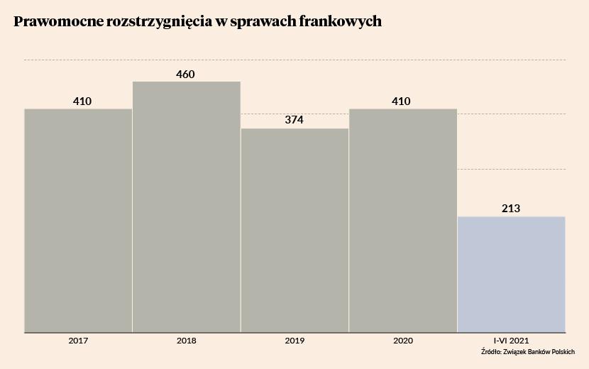 Z danych ZBP wynika, że w pierwszej połowie 2021 r. prawomocnie skończyło się 213 sporów sądowych. Nie odbiega to szczególnie od statystyk lat ubiegłych. Od 2017 r. prawomocnie skończyło się łącznie 1867 procesów. Licząc od października 2019 r. - kiedy to zapadło orzeczenie TSUE w sprawie państwa Dziubaków – 668.