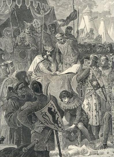15 czerwca 1215 r. na łące w Runnymede pod Windsorem spotkali się władca i zbuntowani baronowie. Tam po negocjacjach Jan bez Ziemi podpisał Wielką Kartę Swobód - dokument ograniczający jego władzę. Formalnie była przywilejem mającym równocześnie znamiona umowy między królem a wasalami. Ograniczała władzę w dziedzinie skarbowej (nakładanie podatków za zgodą rady królestwa) i sądowej (zakaz więzienia lub karania bez wyroku sądowego), określając uprawnienia baronów, duchowieństwa i zakres swobód klas niższych.