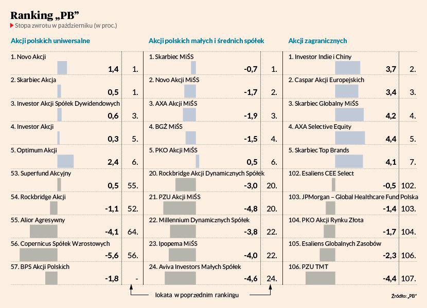 Zarządzany przez niego PKO Akcji Małych i Średnich Spółek awansował właśnie na 4. miejsce w rankingu „PB”. Dzieli je z branżowym nowicjuszem — funduszem BGŻ Małych i Średnich Spółek, który w październiku stracił 1,5 proc., ale wynikami od początku działalności wyróżnia się na tle osłabionej konkurencji.