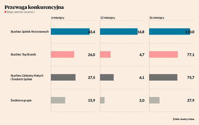 Choć ta opinia brzmi trochę górnolotnie, to zarządzającego bronią osiągnięte wyniki: trzy fundusze Skarbca TFI w minionych sześciu miesiącach osiągnęły ponad 25-procentową stopę zwrotu. Rekordzista — Skarbiec Spółek Wzrostowych — dał zarobić 41,2 proc., przy średniej dla grupy wynoszącej 14,5 proc. Wszystkie trzy to fundusze akcyjne globalnych rynków rozwiniętych, za które odpowiada zespół złożony z Bartosza Szymańskiego, Tomasza Piotrowskiego, Pauliny Brandstatter i Michała Cichosza. Ostatnie trójka jest odpowiedzialna za te fundusze zaledwie od początku roku.