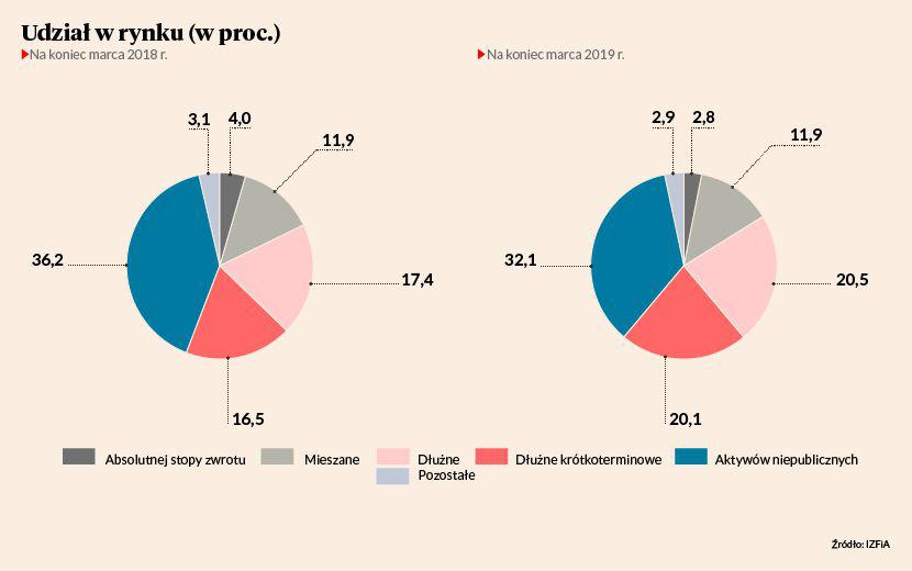Zmniejszył się udział funduszy aktywów niepublicznych i absolutnej stopy zwrotu, zwiększył — dłużnych (w tym krótkoterminowych). Łącznie rodzime TFI zarządzają aktywami o wartości 257,6 mld zł. Przed rokiem było to o ponad 30 mld USD więcej.