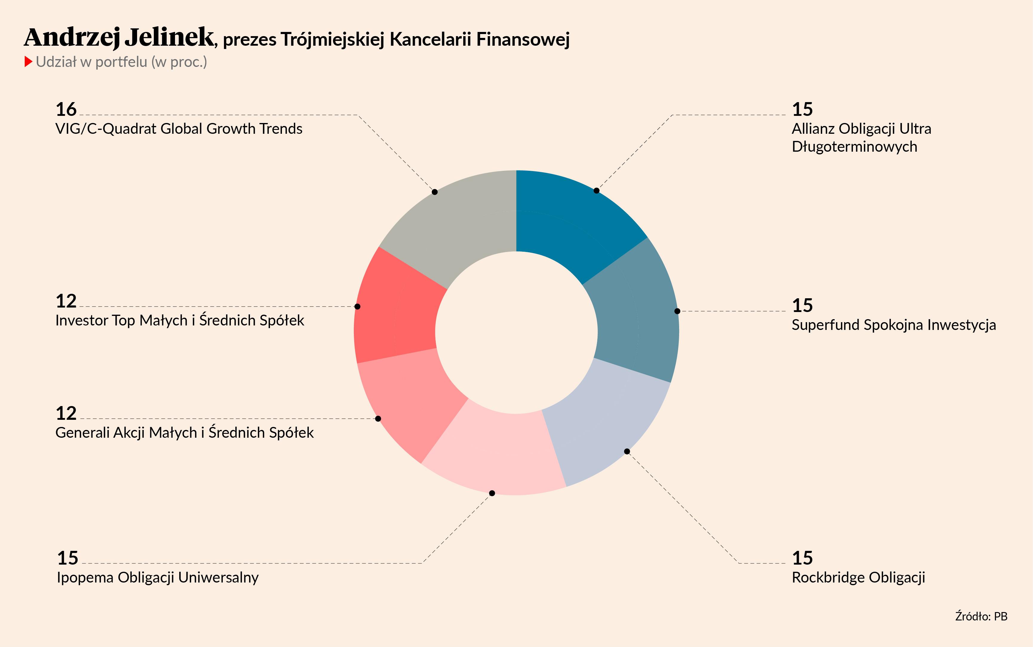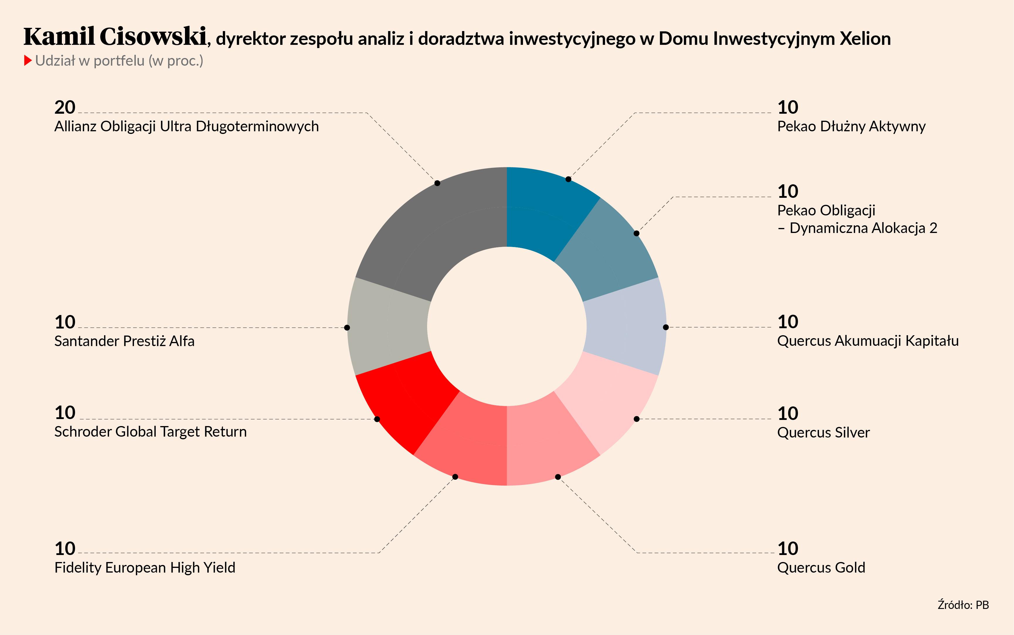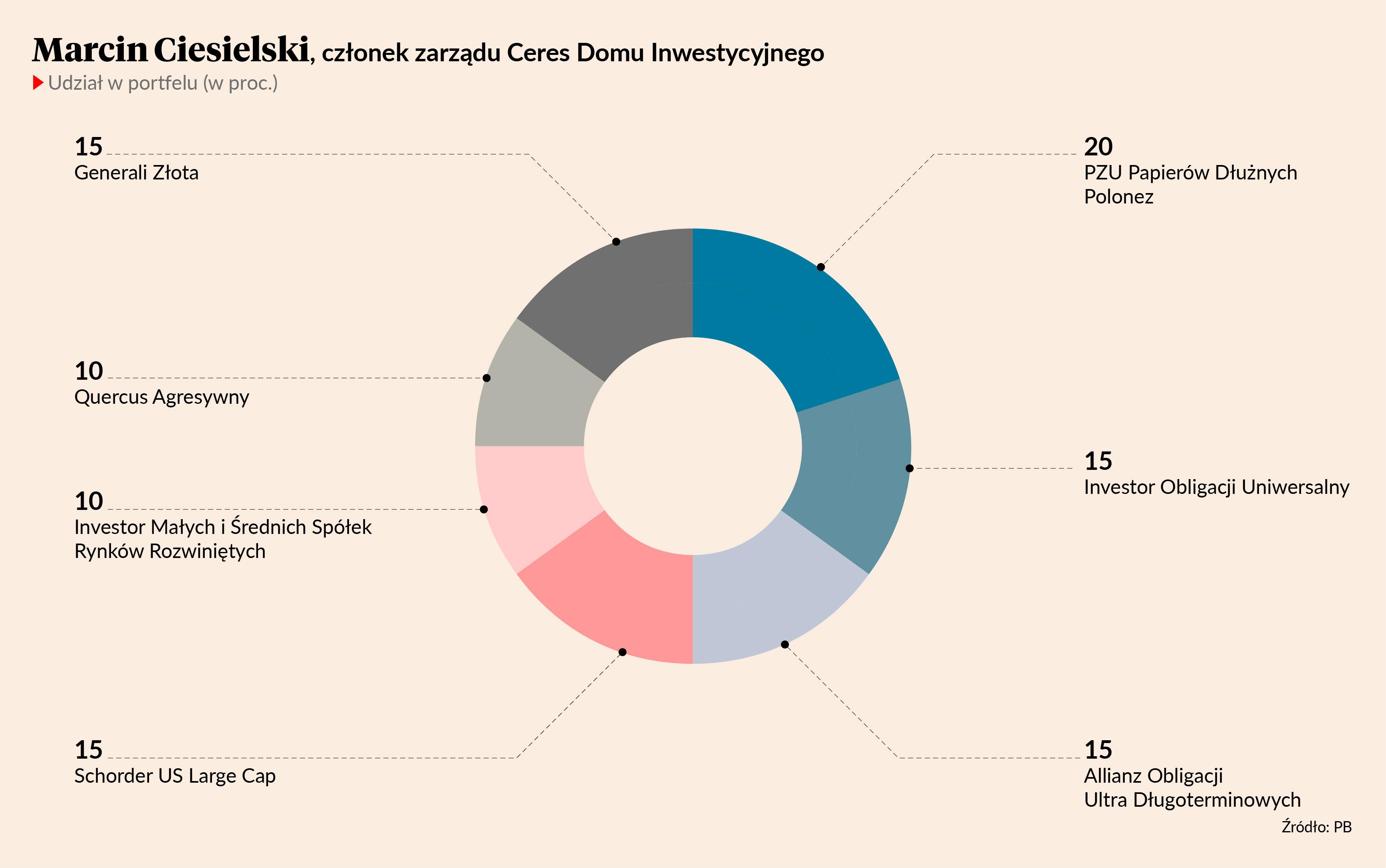 Mimo dobrych perspektywach dla rynków należy zachować ostrożność. Jestem neutralnie nastawiony do rynków akcyjnych, pozytywnie do długoterminowego długu oraz do metali szlachetnych. Część dłużną alokuję w długoterminowe obligacje skarbowe, zarówno poprzez polskie: PZU Papierów Dłużnych Polonez, Investor Obligacji Uniwersalny, jak i amerykański Allianz Obligacji Ultra Długoterminowych. Uważam, że 2025 będzie rokiem silnego spadku rentowności, co powinno przynieść nawet dwucyfrowe stopy zwrotu obligacji o długiej duracji. Część udziałową inwestuję w akcje dużych spółek amerykańskich poprzez: Schroder US Large Cap i mniejszych poprzez Investor Małych i Średnich Spółek Rynków Rozwiniętych, a także akcje polskie poprzez Quercus Agresywny. Akcje amerykańskie nadal pozostaną silne, zakładam wzrost szerokości rynku - do hossy na dużych spółkach powinny dołączyć mniejsze. Akcje polskie były słabe w drugiej połowie 2024 r., wyceny spółek są bardzo atrakcyjne i mogą one być głównymi beneficjentami poprawy sytuacji w Ukrainie. W portfelu nie mogło zabraknąć złota poprzez Generali Złota. Uważam, że obecne otoczenie geopolityczne i makroekonomiczne bardzo sprzyja metalom szlachetnym. Dodatkowo złoto obniża ryzyko portfela oraz poprawia jego oczekiwaną stopę zwrotu.