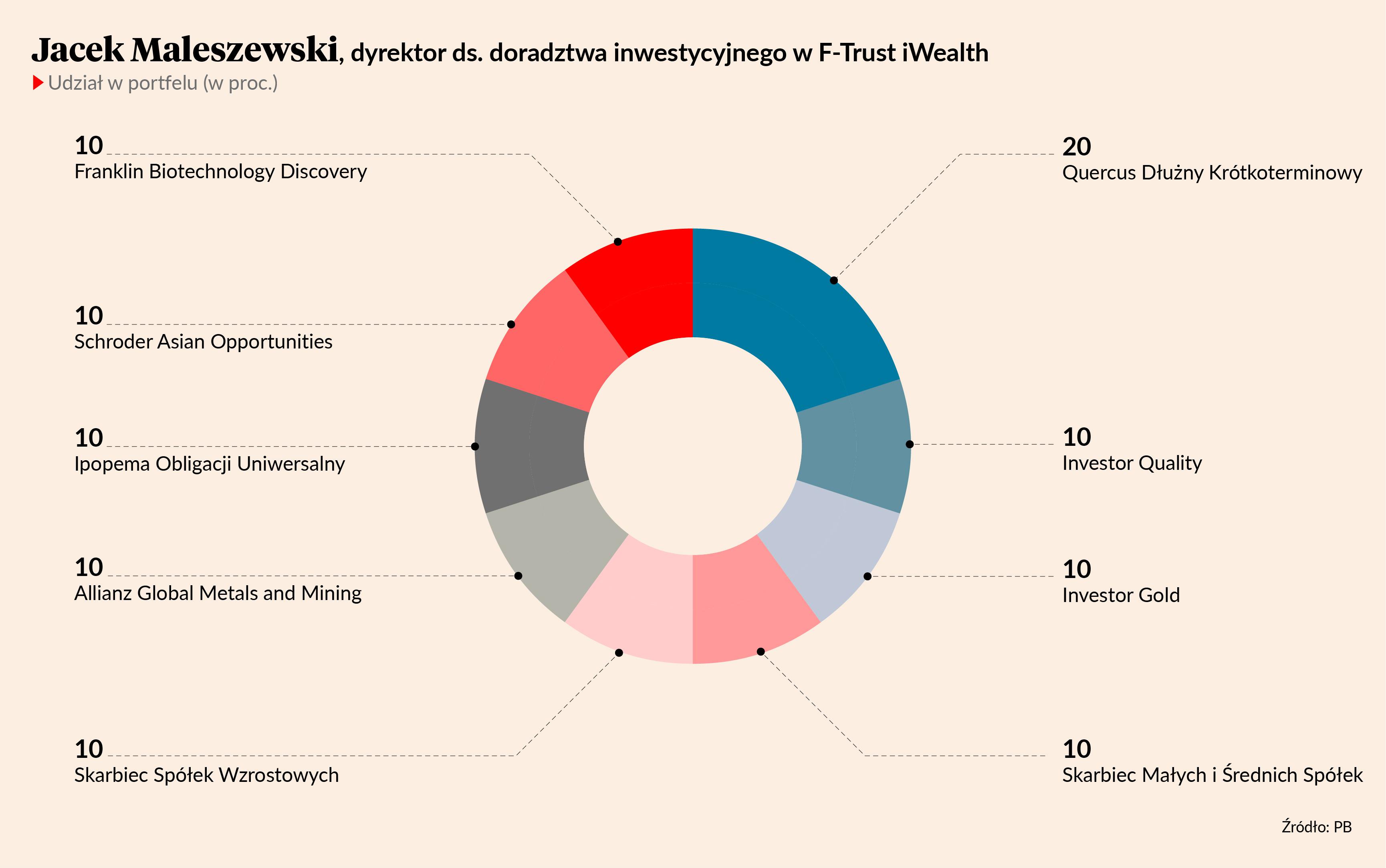 W nowy rok wchodzę z mocno zdywersyfikowanym portfelem z przewagą akcji. Inflacja i bezrobocie pozostają pod kontrolą, a ponieważ gospodarka wciąż jest w fazie ożywienia, Fed nie ma powodu śpieszyć się z obniżaniem stóp procentowych. Jednak obecne oczekiwania rynkowe co do dalszych obniżek są nieco zbyt pesymistyczne, stąd pozycje w funduszu Franklin Biotechnology Discovery i Skarbiec Spółek Wzrostowych, które powinny korzystać na niższych stopach i dalszym rozwoju sektora sztucznej inteligencji. Ze względu na niskie wyceny związane z ryzykiem geopolitycznym, które w ciągu roku powinno ustępować, mam też zdecydowanie optymistyczne podejście do polskiego rynku akcji, zwłaszcza małych i średnich spółek. Dotyczy to również polskich obligacji długoterminowych, które obecnie również są nieadekwatnie wyceniane. Dalsze globalne ożywienie gospodarcze powinno wspierać sektor surowcowy, wspomagany przez kolejne stymulusy chińskiego rządu, stąd obecność w portfelu Allianz Global Metals and Mining i Schroder Asian Opportunities. Wciąż optymistycznie postrzegam też rynek złota. W portfelu mamy również 20-procentowy zapas gotówki w postaci funduszu Quercus Dłużny Krótkoterminowy na ewentualne zakupy w przypadku niespodziewanych przecen.