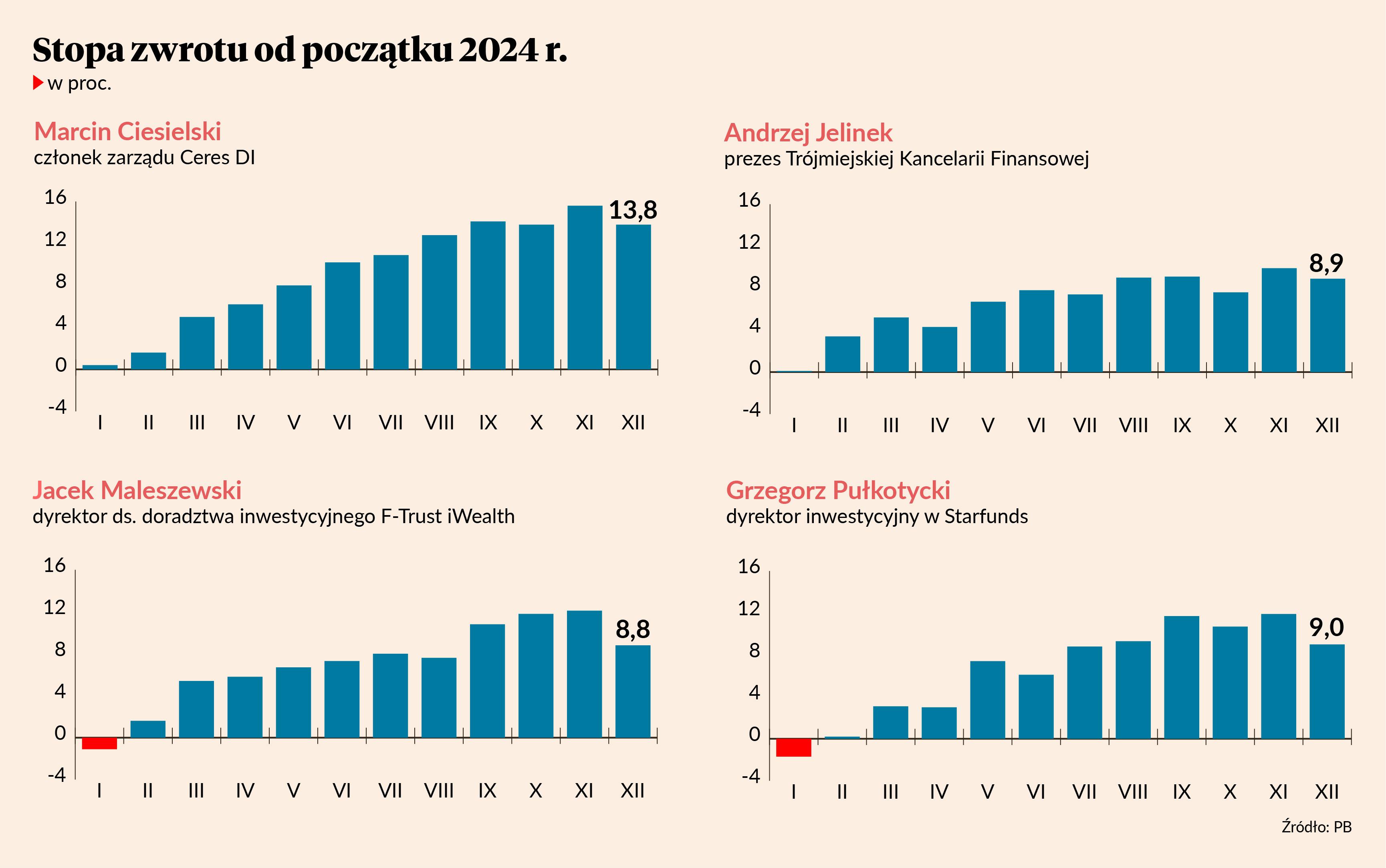 Autorzy czterech z pięciu portfeli funduszy na 2025 r. uczestniczyli też w ubiegłorocznej edycji naszego quizu. Obowiązywały wówczas nieco inne zasady - zmian w portfelu można było dokonać tylko dwa razy w roku, na koniec dowolnego miesiąca. Portfele zaproponowane na 2024 r. przyniosły od 8,8 proc. do 13,8 proc. zysku. Najlepsza okazała się propozycja Marcina Ciesielskiego, który korekty dokonał tylko raz – na przełomie kwietnia i maja. Od tamtego momentu monitorował już tylko stopę zwrotu, która jako pierwsza przekroczyła 10 proc. i jako jedyna pokonała 15 proc., choć na koniec roku nieco spadła. Podobny los spotkał w grudniu 2024 r. portfele wszystkich uczestników.