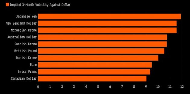 Oczekiwana przez traderów zmienność na najbliższe trzy miesiące w notowaniach głównych walut względem dolara. Źródło: Bloomberg.