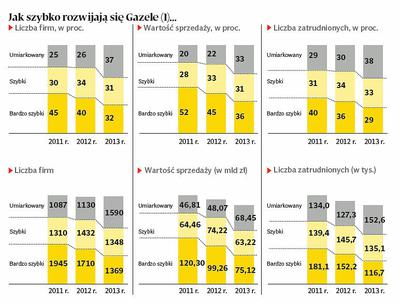 W ostatnich trzech latach liczba firm uczestniczących w rankingu Gazel Biznesu wynosiła około 4300 i podlegała niewielkim wahaniom. Łączna sprzedaż tej grupy przekraczała 200 mld zł rocznie, przy czym w latach 2011-13 odnotowujemy pewną tendencję spadkową. Podobne spadki obserwujemy w zatrudnieniu. W 2011 r. łącznie przekraczało ono 450 tys., a w 2013 r. było to niewiele ponad 400 tys. osób.