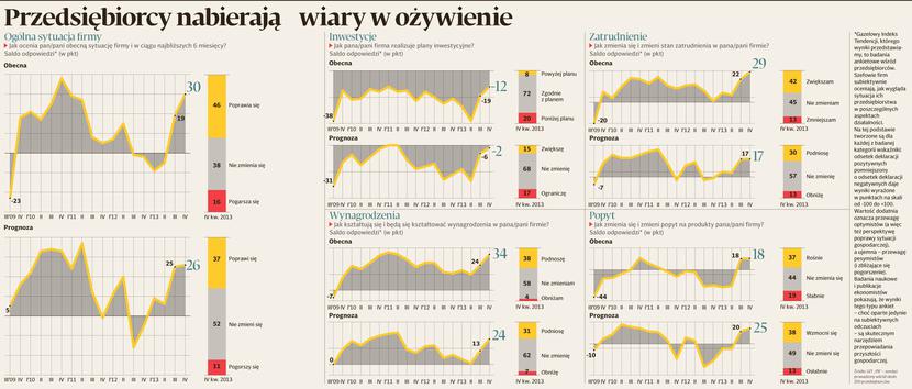 — Od ostatnich miesięcy 2013 r. zauważamy wzrost popytu. Kondycja naszej firmy jest dobra, a perspektywy wydają się obiecujące — mówi Jacek Podgórski, dyrektor handlowy MASZ Gliwice. Przedsiębiorcy przestają też ciąć ceny swoich produktów (a więc i własne marże), a powoli zaczynają myśleć o podwyżkach. Zamiar podnoszenia cen deklaruje 19 proc. firm wobec, 7 proc. pół roku temu. To zła wiadomość dla konsumentów, ale pokazuje, że firmy nie boją się już słabego popytu i czują się coraz mocniej na rynku.