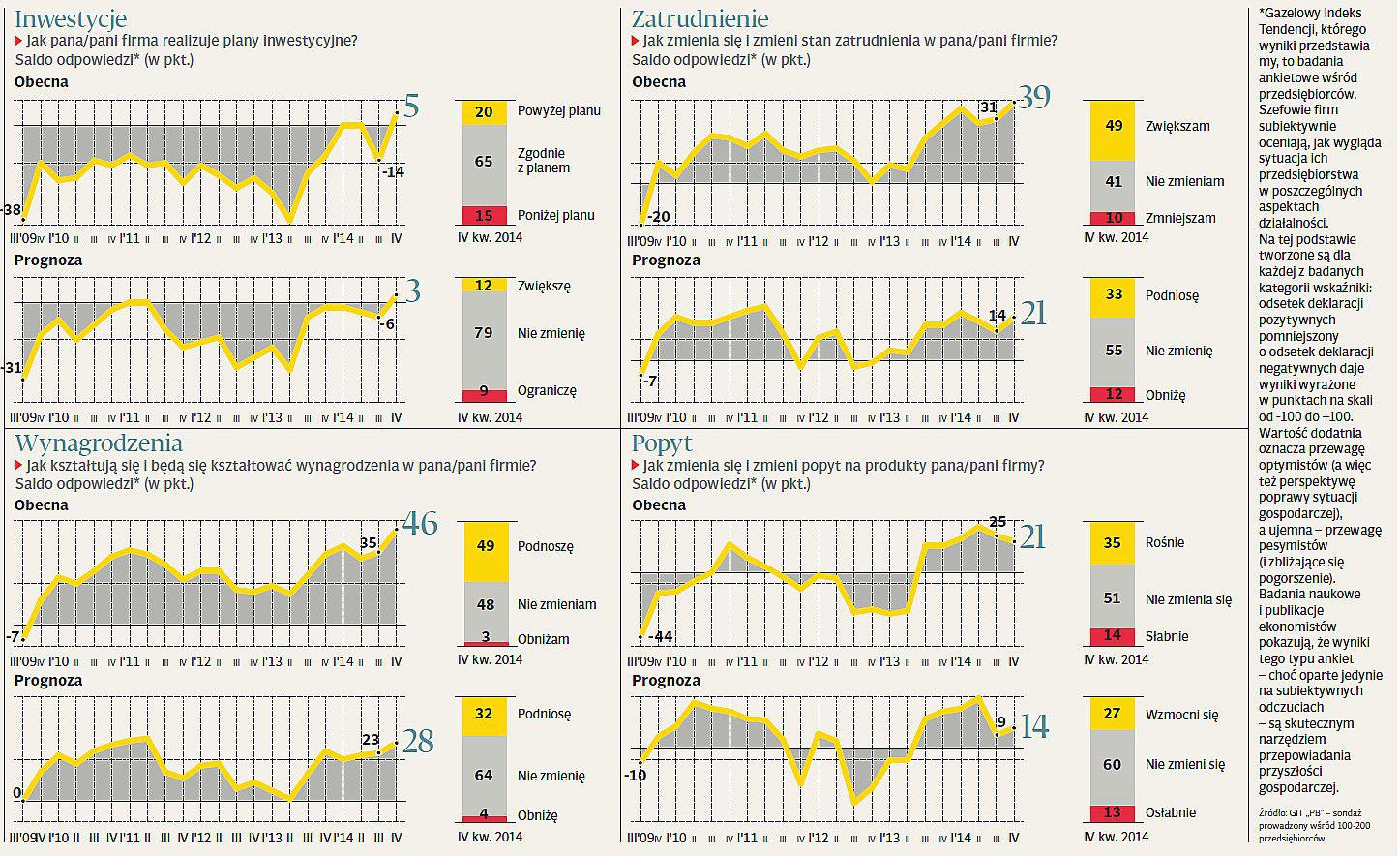 Spowolnienie gospodarcze? Nic z tych rzeczy. Dla Gazel Biznesu, które wzięły udział w najnowszej edycji badania ankietowego „PB”, koniunktura w polskiej gospodarce jest mocna i wyraźnie się poprawia. Małe i średnie firmy dawno nie czuły się na rynku tak pewnie jak obecnie. Według badania „PB”, w czwartym kwartale 2014 r. aż 44 proc. Gazel Biznesu zadeklarowało, że ich sytuacja się poprawia, a jedynie 9 proc. czuje pogorszenie. Saldo odpowiedzi pozytywnych i negatywnych wynosi więc 35 pkt. proc., co jest najwyższym wynikiem od 16 kwartałów.