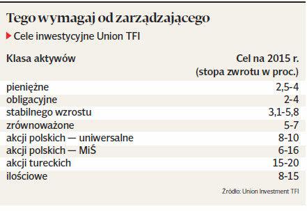 Zarządzający funduszy inwestycyjnych, które żyją z pieniędzy klientów, zwykle tryskają urzędowym optymizmem. Nie inaczej jest z ekspertem Union Investment TFI — Zbigniew Jakubowski spodziewa się w nowym roku powtórzenia kilkuprocentowych zysków ze strategii bardziej bezpiecznych (a więc funduszy pieniężnych, obligacyjnych czy mieszanych) oraz nawet kilkunastoprocentowych zysków z akcji. Niemal dokładnie przed rokiem prognozy były… niemal dokładnie takie same. W większości się sprawdziły — z jednym wyjątkiem: na polskich akcjach trudno było zarobić. Stopa zwrotu z WIG jest bliska zeru, małe i średnie spółki są pod kreską, podobnie jak fundusze — te o uniwersalnym charakterze straciły średnio 5 proc. Fundusz akcyjny Uniona wyszedł nad kreskę (3,4 proc.), ale ten inwestujący w firmy o małej i średniej kapitalizacji stracił ponad 9 proc. Zbigniew Jakubowski przekonuje, że straty uda się odrobić, a drogą do tego będzie dobra selekcja i postawienie na wybrane małe i średnie spółki, m.in. przemysłowe i usługowe, oraz eksporterów — szczególnie z ekspozycją na Europę Zachodnią. — Słabiej prezentuje się obecnie potencjał banków oraz spółek z sektora utilities, choć ich sytuacja może się poprawić w drugim półroczu, kiedy to PKB zacznie wyraźnie przyspieszać — uważa ekspert UI TFI. Jego zdaniem, WIG w 2015 r. wzrośnie o 8-10 proc., a małe i średnie spółki dadzą zarobić 6-16 proc. Najbardziej perspektywiczne zagraniczne rynki to natomiast Niemcy, Irlandia i Hiszpania, umiarkowanie atrakcyjne — Włochy, a najmniej — Francja, Portugalia i Grecja. Spośród rynków wschodzących w cenie powinny być te, które mają duży deficyt obrotów bieżących (wynikający z importu surowców) i relatywnie słabą walutę. Do tych państw należą Indie, Tajlandia, Korea, Tajwan i Turcja.