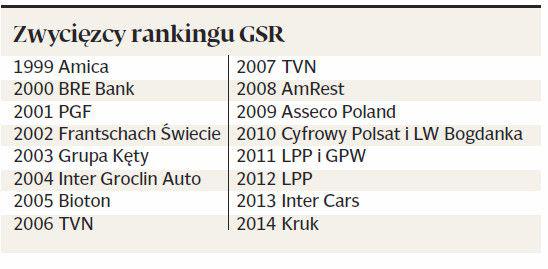 Amica, która została głosami analityków, maklerów i doradców pierwszą Giełdową Spółką Roku za 1999 r., w najnowszym zestawieniu znalazła się na 22. pozycji. W trzeciej dziesiątce Rankingu GSR 2014 są też laureaci z 2003 r. (Grupa Kęty) oraz 2011 i 2012 r. (w obu latach triumfowało LPP). Na końcu pierwszej i drugiej dziesiątki znaleźli się: TVN (zwycięzca z 2006 i 2007 r.), AmRest (wygrał w 2009 r.) i Inter Cars (13), a w ścisłej czołówce znalazło się miejsce dla mBanku (jego poprzednik — BRE Bank — wygrał plebiscyt za 2000 r.) i Cyfrowego Polsatu (2010 r.).