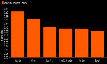 Stopy zwrotu, skorygowane o ryzyko, dla najlepiej zachowujących się głównych indeksów z rynków wschodzących, od daty wyborów w USA. Źródło: Bloomberg.