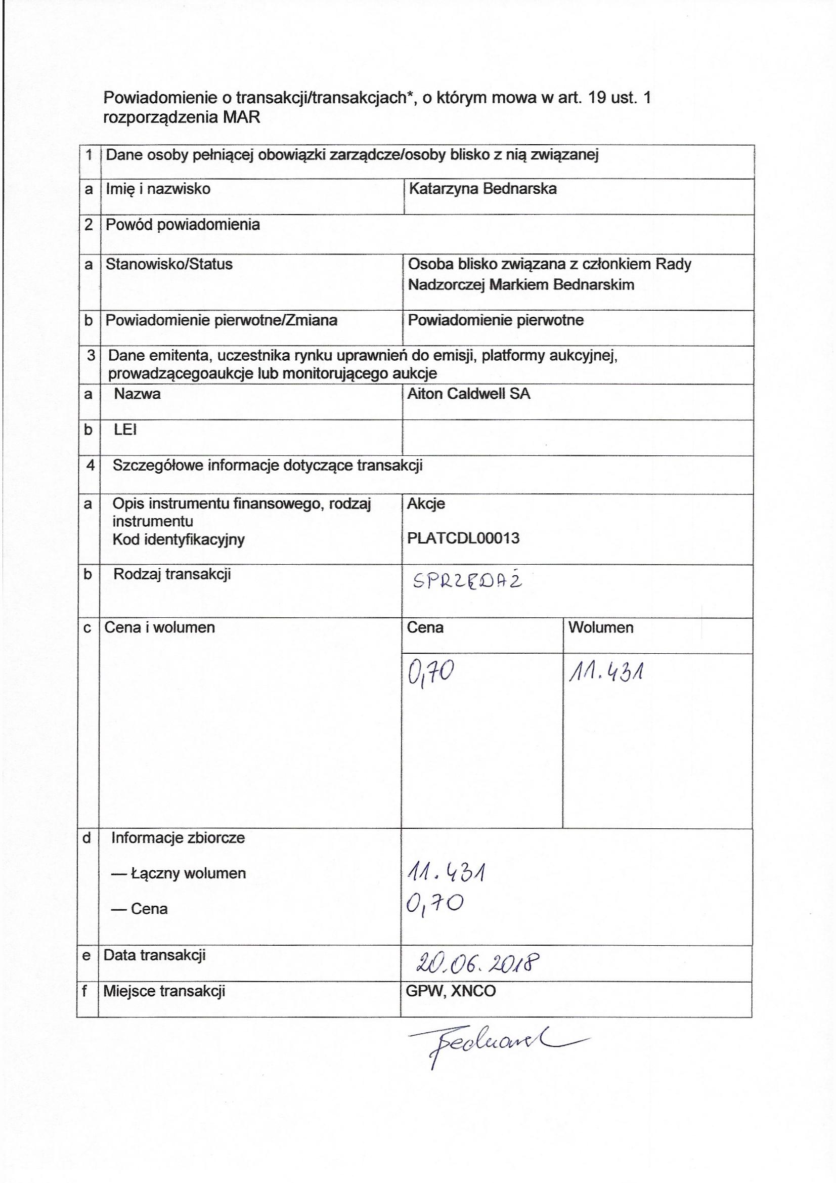 | Zarząd Aiton Caldwell S.A. („Emitent”) w wykonaniu obowiązku wynikającego art. 19 ust. 3 Rozporządzenia Parlamentu Europejskiego i Rady (UE) nr 596/2014 z dnia 16 kwietnia 2014r. w sprawie nadużyć na rynku oraz uchylające dyrektywę 2003/6/WE Parlamentu Europejskiego i Rady i dyrektywy Komisji 2003/124/WE, 2003/125/WE i 2004/72/WE („Rozporządzenie MAR”) informuje, iż w dniu 23 czerwca 2018 r. (sobota) o godz.: 08:47 wpłynęło do Spółki od Pani Katarzyny Bednarskiej zawiadomienie (powiadomienie pierwotne) złożone na podstawie art. 19 ust. 1 Rozporządzenia MAR o dokonaniu transakcji sprzedaży akcji Aiton Caldwell S.A. Z treści w/w pisma wynika, iż w dniu 20 czerwca 2018 r. Pani Katarzyna Bednarska – osoba blisko związana z członkiem Rady Nadzorczej Emitenta Markiem Bednarskim dokonała transakcji sprzedaży akcji Aiton Caldwell S.A. (kod identyfikacyjny: PLATCDL00013). Poniżej Emitent podaje szczegółowe informacje dotyczące transakcji przekazane przez Panią Katarzynę Bednarską: 1. Opis instrumentu finansowego, rodzaj instrumentu: Akcje. 2. Kod identyfikacyjny: PLATCDL00013. 3. Rodzaj transakcji: sprzedaż. 4. Cena i wolumen: CENA WOLUMEN 0,70 zł 11.431 5. Informacje zbiorcze: łączny wolumen: 11.437 cena: 0,70 zł 6. Data transakcji: 20.06.2018 r. 7. Miejsce transakcji: GPW, XNCO. W załączeniu przedstawiamy skan otrzymanego powiadomienia. |
