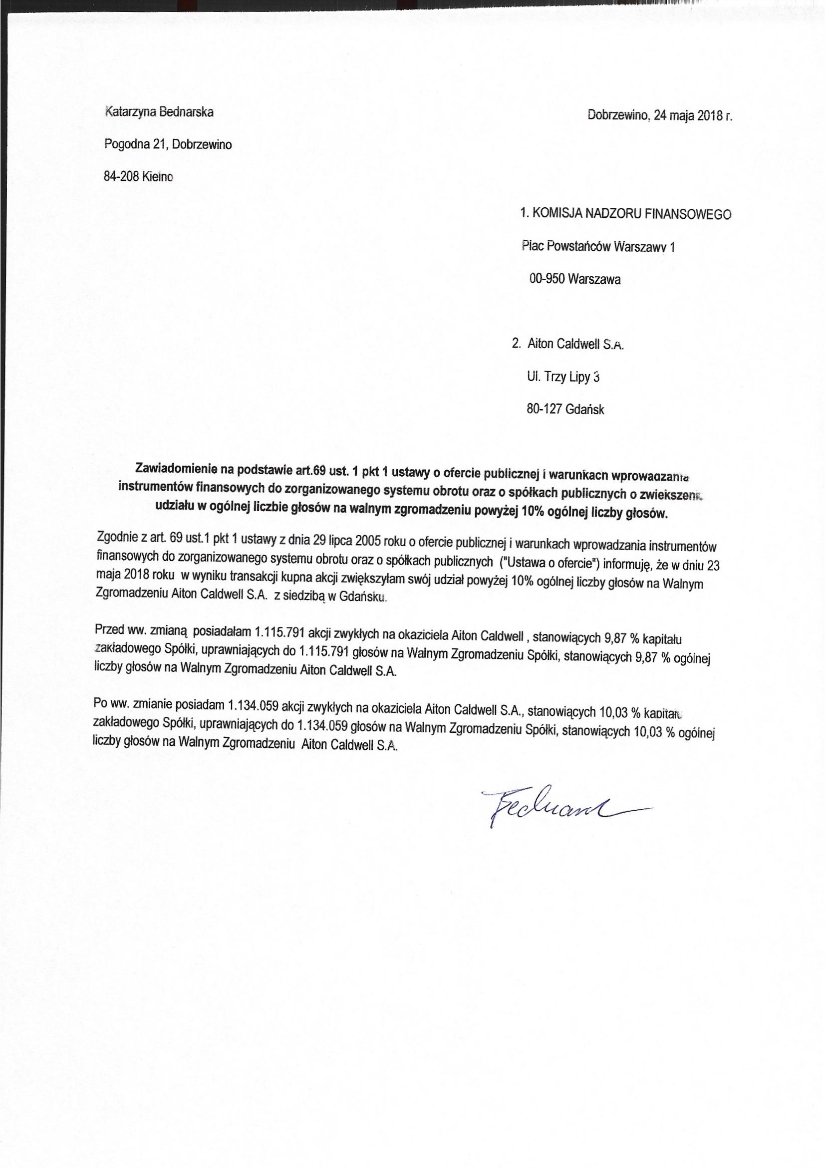 | Zarząd Aiton Caldwell S.A. („Spółka”) w wykonaniu obowiązku wynikającego z art. 70 pkt 1 Ustawy o ofercie publicznej i warunkach wprowadzania instrumentów finansowych do zorganizowanego systemu obrotu oraz o spółkach publicznych z dnia 29 lipca 2005 r. (t.j. z dnia 15.09.2016 r., Dz. U. z 2016 r. poz. 1639) informuje, iż w dniu dzisiejszym, tj. 24 maja 2018 r. wpłynęło do Spółki od Pani Katarzyny Bednarskiej zawiadomienie na podstawie art. 69 ust. 1 pkt. 1 ustawy o ofercie publicznej i warunkach wprowadzania instrumentów finansowych do zorganizowanego systemu obrotu oraz o spółkach publicznych o zwiększeniu udziału w ogólnej liczbie głosów na walnym zgromadzeniu powyżej 10% ogólnej liczby głosów z dnia 24 maja 2018 r. Z treści w/w pisma wynika, iż w dniu 23 maja 2018 r. w wyniku transakcji kupna akcji na rynku New Connect Pani Katarzyna Bednarska zwiększyła swój udział powyżej 10% ogólnej liczby głosów na Walnym Zgromadzeniu Aiton Caldwell S.A. Przed w/w transakcją posiadała ona 1.115.791 akcji zwykłych na okaziciela Aiton Caldwell, stanowiących 9,87 % kapitału zakładowego Spółki, uprawniających do 1.115.791 głosów na Walnym Zgromadzeniu Spółki, stanowiących 9,87 % ogólnej liczby głosów. Po dokonaniu w/w transakcji posiada ona 1.134.059 akcji zwykłych na okaziciela Aiton Caldwell, stanowiących 10,03 % kapitału zakładowego Spółki, uprawniających do 1.134.059 głosów na Walnym Zgromadzeniu Spółki, stanowiących 10,03 % ogólnej liczby głosów. W załączeniu przedstawiamy skan otrzymanego powiadomienia. |