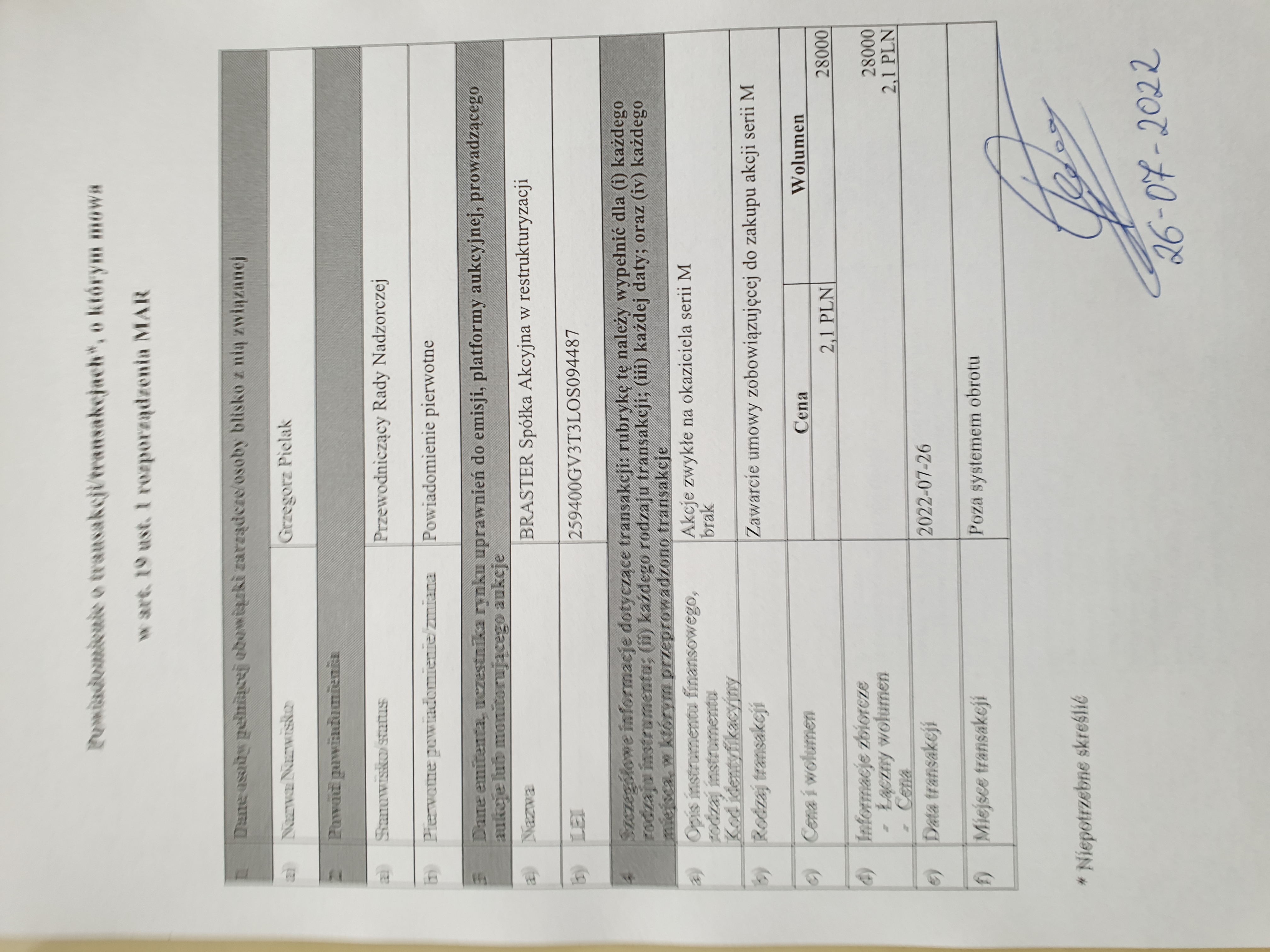 | Zarząd BRASTER S.A. w restrukturyzacji („Spółka”) informuje, iż w dniu 26 lipca 2022 r. wpłynęło do Spółki od Pana Grzegorza Pielaka - Przewodniczacego Rady Nadzorczej - zawiadomienie o transakcji dotyczącej akcji Spółki dokonanej w dniu 24 lipca 2022 r. Treść ww. zawiadomienia Spółka przekazuje w załączeniu. | |||||||||||